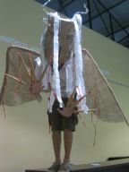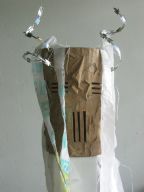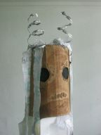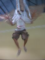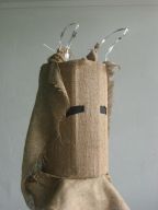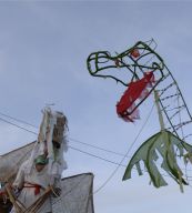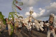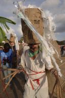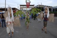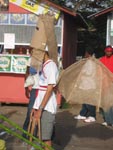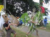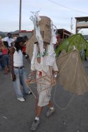 Dragon's desire to turn away from the water is thwarted by the Imps who drag him forward in chains. Like other demonic characters in the Carnival, such as the Jab Molassies and the Beast, the Dragon's bonds refer directly to Trinidad's legacy of slavery. The irony of playing Mas is that playing a slave becomes an act of empowerment, since by choosing to play the role, one asserts the freedom to control one's fate. Moreover, the conflation of Devils with slaves is an ironic play on one of the earliest masquerades in Carnival, in which French Creole planters would imitate the debased position of their own plantation slaves ( "Negues Jadins" in patois). After Emancipation in 1838, when former slaves were allowed full participation in Carnival, they adopted role of Negue Jadins and burlesqued the planters' characterization of themselves – an mockery of a mockery. Lovelace describes how Devil Mas involves the blackening of already-black skin, a gesture that recalls the white planters' "blackface" Mas while reclaiming the potency of black identity, "to make their very blackness a menace. " (113) The Imps play a dual role, as both instrument of the Dragon's bondage and as a kindred demonic spirits. Carnival scholar Max Harris suggests this merging of symbols recalls the shared iconography that links Devils and slaves, stating "black humanity had to be demonized by whites in order to justify slavery." (111, "Playing Devil" The Drama Review. MIT Press, Fall 1998) Today, the Devil Mas theme of dehumanization still has relevance within the economic inequalities plaguing modern Trinidad. Our Imps dragged their dragon by a chain of Carnival beads typical of commerical "Pretty mas". The Imps themselves shared the Dragon's street-material aesthetic, with burlap wings, masks of brown corrugated cardboard and horns of razor wire. At the same time, their white hair, made from industrial plastic sugar sacks, refered back to their Negue Jadin plantation past. Their razor-wire arm bands presented a similar class paradox, recalling simultaneously the manacles of slavery and the fancy armbands that adorn the generic Pretty Mas costume.