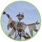 In 2014, The High Line, New York's celebrated elevated park, inaugurated its final span, extending public access to the former West Side rail line over the Penn Rail Yards along the Hudso River, and up to 34th Street. Friends the High Line invited PAW to design a procession to mark the opening of the park’s third section, extending its path over the Rail Yards up to 34th Street. Gonzalo Casals, FHL’s Director of Public Programs, envisioned a neighborhood event that would involve local residents in the design process and offer them the opportunity to take very first steps onto the new span. Over the course of several weeks, PAW led many town hall meetings to gather stories, images, and perspectives on the High Line, and far West Side neighborhoods through which it runs. In August, these personal histories and reflection took on physical form through a series of free drop-in workshops at Westbeth Center for the Arts. Drawing from the structural aesthetics of the High Line and the surrounding industrial architecture, participants created giant railroad signal lights, whose lenses were illuminated with stained-glass vignettes exploring a treasury of West Side stories. Iconic images captured the full range of a neighborhood’s evolving ethos, evoking meat-packing plants and disco clubs, Florent and von Furstenberg, longshoreman and drag queens, liners and diners, and much more. The procession began at the southern end of the High Line, led by an airborne 1930 locomotive and fabled West Side Cowboy. At each stop a different contingent of marchers joined the growing procession, identified by colored silk banners and led by giant totemic figures surrounded by long banners of silk. As each group ascended to the park, a new chapter of West Side vernacular history was introduced: Movers and Makers; Meat, Markets,& Malllowmars; On the Waterfront; The Wild West Side; and Vision & Re-Vision. Each krewe formed a corrdior on the narrow path to greet the next, and when last group sashayed down the line, everyone let loose in wild circle dance. Ultimately more than 500 local residents, artists, activists, and community members – along with the occasional movie star and Senator – came on board to make an unforgettable inaugural journey to 34th Street.