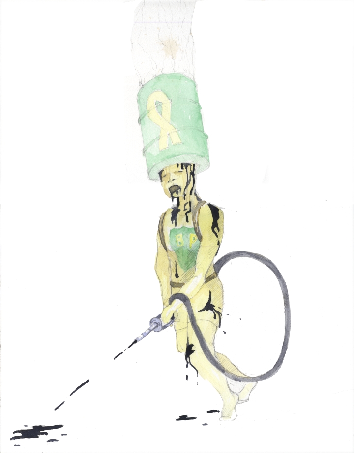 This jumbie find inspiration in the Canboulay’s ritual re-enactment of economic sabotage, a destructive act made creative. Like sugar, oil promises short-term addictive pleasure at the cost of long-term misery. The pre-Lenten excesses of the Carnival are fertile ground for the oil jumbie, who assails the crowd with sweet crude oil from his phallic gas-pump tail. Now, the equally-flammable oil has supplanted sugar as the driver of the Trindadian economy and, by extension, the economy of Carnival in particular. Still, as with the original Canboulay, the Oil Jumbie bites the hand that feeds. Grease-painted in the green and gold colors of British Petroleum, he executes a classic Carnivalesque inversion in which the very fuel for Carnival is turned upon itself.