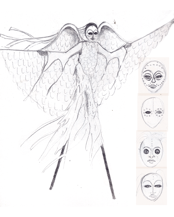 The legend of Icarus tells us that technology will not ultimately satisfy our desire to transcend our earthbound selves. True flight occurs on wings of the mind, whether on the mythic wings of angels and demons, or the virtual wings of today's digital avatars of the gaming universe. Four stilt-walkers avatars appear in Act III, waering translucent wings and traditional West Indian screen masks enter the playing area. Their 9 attendants are tall abstract “spirit poles” loosely figurative yet ethereal and formless.