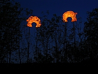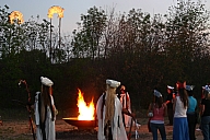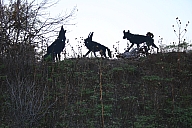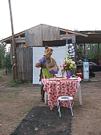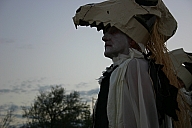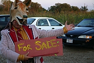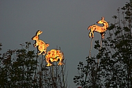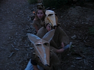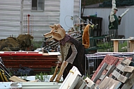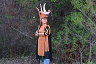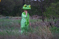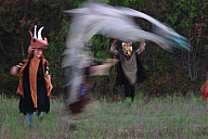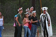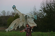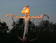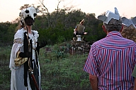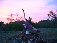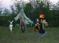 In summer 2006 we were invited by Hip Pocket Theatre to collaborate with puppeteer and performance artist Erin Orr to create a community pageant just outside of Fort Worth, Texas. Guidued by local events, we became interested in the recent increase in coyote encounters with residents around Lake Worth, and by the ensuing attempts by local environmental groups to propose strategies for better co-existence with the creatures. Coyote's Way merged vivid first-hand account of local residents' coyote experiences with ribald Native American Trickster-myths. What evolved was our first "Puppetscape", a series of looping vignettes and tableaus installed (or sometimes wandering) in the local landscape, a former shooting range, interestingly enough. We provided three shaman guides to lead small groups into Coyote's world, and perhaps help make sense (or nonsense) of what they found there. The project took on its own local flavor as local community members got involved, first simply to help build elements for the pageant, and eventually to take on roles as performers (many for the first time). |
