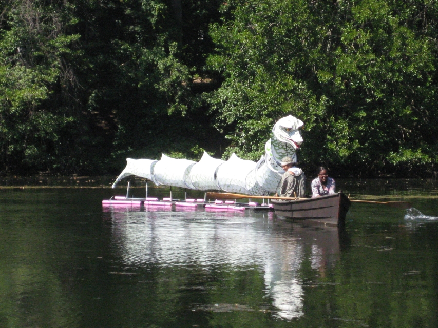 In the summer of 2008, we teamed up with Rocking the Boat, a program dedicated to teaching Bronx youths boat-building and on-water skills. We were invited to work with a group of RTB kids at Historic Philipsburg Manor to create giant puppets for their annual Legends event, based on the Legend of Sleepy Hollow. In 7 weeks, the RTB kids used their formidable boat-building skills to make a dozen new giant puppets and illuminated figures to inhabit the nocturnal Sleepy Hollow landscape during the 2 weekends prior to Halloween. Drawing on the orginal Washington Irving text, we designed elements around two main themes: the early American fear of wilderness, and the post-traumatic ghosts of the War for Indenpendence. Irving conjures many images of the Hudson valley landscape come to life – mysterious, metamorphic and hostile. In this spirit we created animated trees (based on the legend of Major Andre's capture in the nearby woods of Tarrytown), the Night Mares, the Lady in White, and an illuminated water-born Leviathan. As of the this writing, the puppets have been completed and rehearsed on schedule, and we eagerly await October, when the students who built them will return to haunt Philipsburg Manor with their performances. Stay tuned . . . Learn more about Philipsburg Manor and the Legends event on 10/18-19 and 10/27-28 Learn more about Rocking the Boat . . .