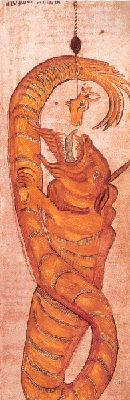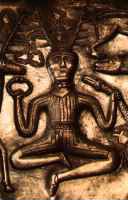 Celtic myth describes Cernunnos (right), a horned deity accompanied by ram-headed serpent. The latter is possibly related to Jormangund, the giant Norse serpent who body is wrapped around the world, his tail grasped in his mouth symbolizing, again the theme of cyclic return. The Norse version of the serpent is not said to be ram-horned, the image at left portrays him with distinctly ovine features.